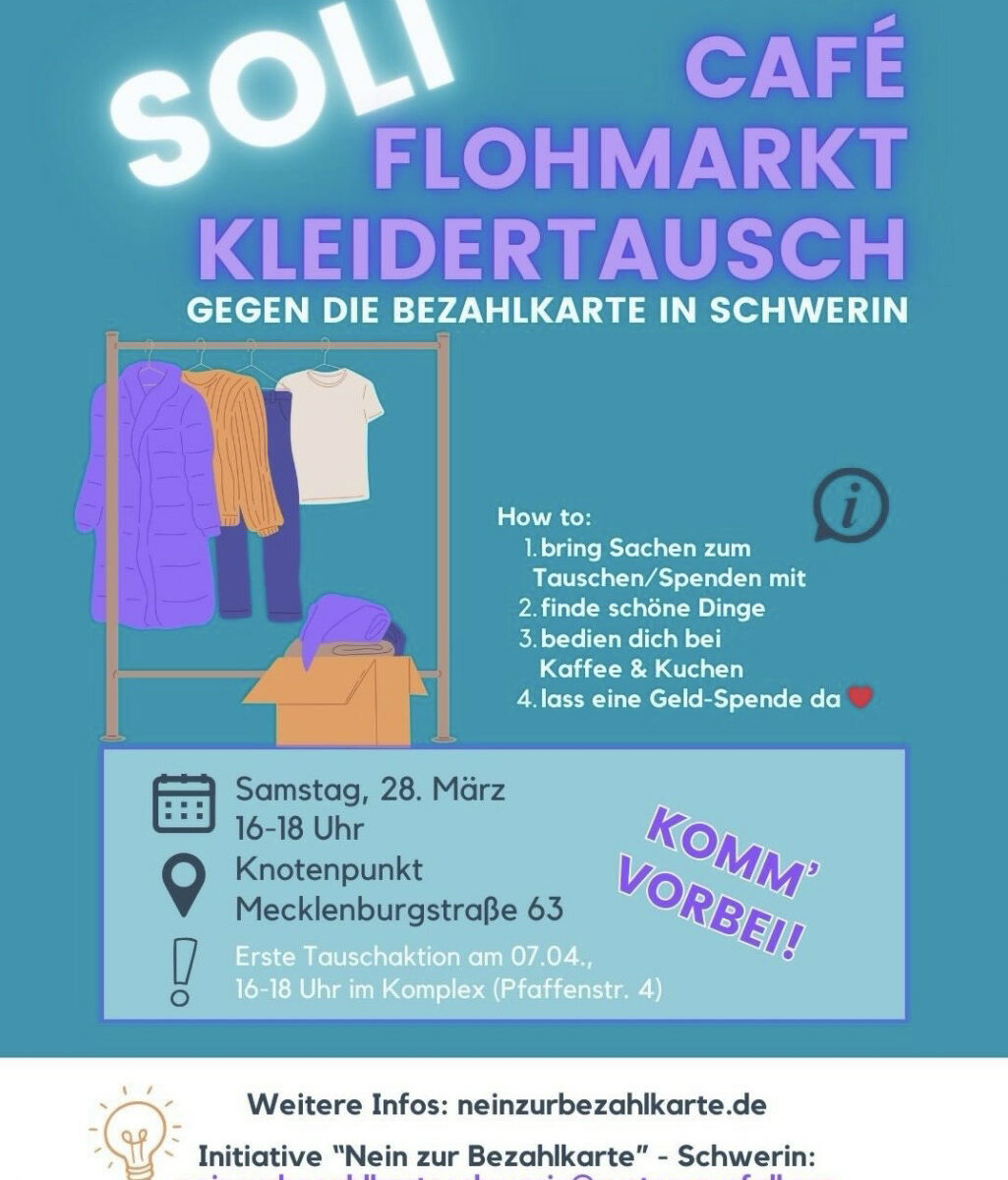 Soli-Flohmarkt:  Soli-Café, Flohmarkt & Kleidertausch gegen die Bezahlkarte in Schwerin Samstag, 28.3. von 16-19 Uhr Komm vorbei zum Stöbern, Kaffee trinken und informieren zu der [...]